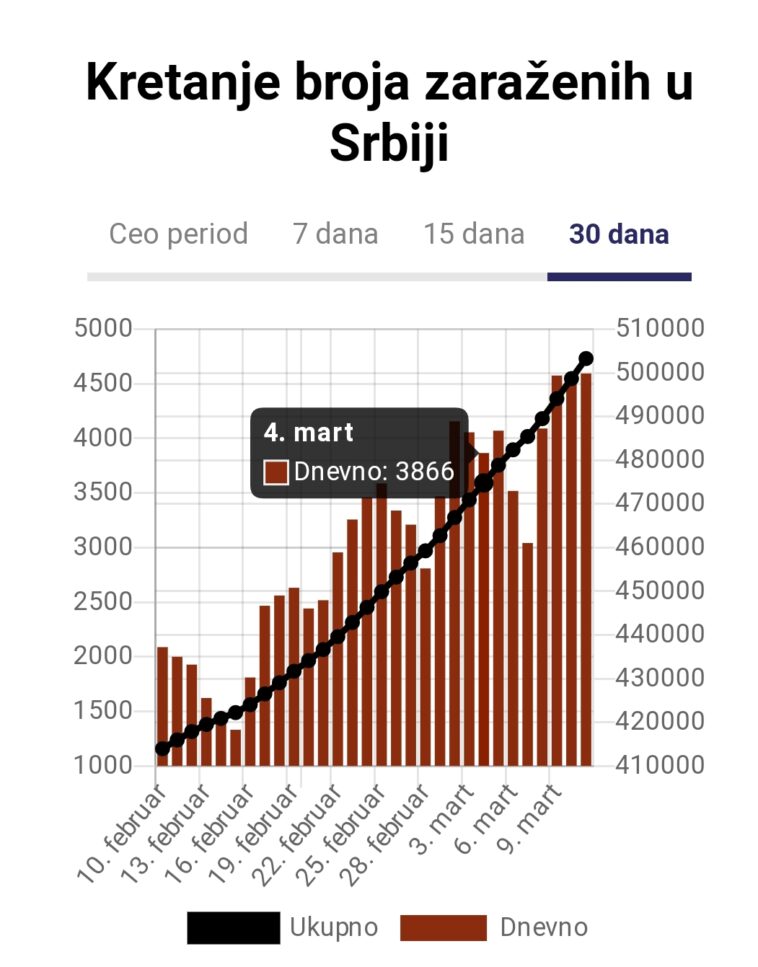 Prateći suvu statistiku, bližimo se broju od 800 zaraženih na 100.000 građana, a time i takozvanoj “crnoj korona-zoni”. Ono što takođe zabrinjava jeste i činjenica da smo četvrti u Evropi po broju zaraženih i umrlih u odnosu na broj stanovnika. Ono što takođe zabrinjava jeste i činjenica da smo trenutno četvrti u Evropi po broju zaraženih u odnosu na broj stanovnika, iza Češke, Estonije i Crne Gore.