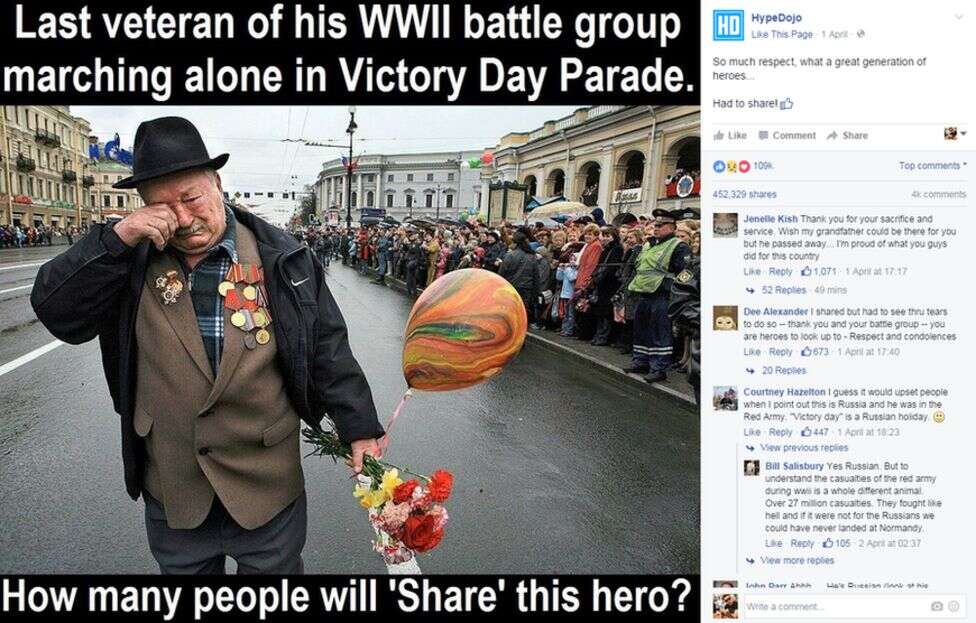 Popularni Facebook meme tvrdi da je taj čovek poslednji preživeli član svoje borbene grupe iz Drugog svetskog rata. Fotografija je stekla više od milion lajkova na Facebook-u, posebno na HipeDojo-u i UNILAD-u – koji su inače više povezani sa urnebesnim šalama.